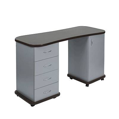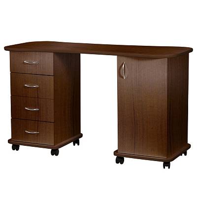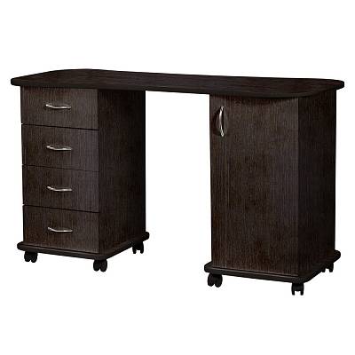 Если Вы желаете купить стильный и удобный стол для маникюра – Эсти-2 сможет полностью удовлетворить Ваши потребности. Он выполнен из качественной ламинированной ДСП, которая отличается высокой прочностью и долговечностью. Ламинированное покрытие легко очищается, не боится воздействия влаги и дезинфицирующих средств, а также длительное время сохраняет красивый внешний вид. Тумбы установлены на колеса, благодаря которым стол можно легко перемещать и поворачивать. В нашем магазине маникюрный стол Эсти-2 можно купить из наличия в цветах складкой программы (венге, венге/белый дуб), или под заказ, в любом другом цвете из каталога.