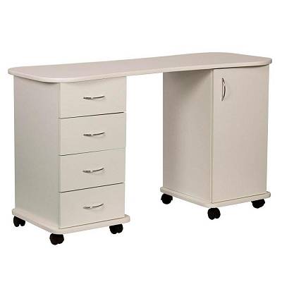 Профессиональный стол маникюрный Эсти-2 выполнен в классическом стиле с применением качественных прочных материалов. Он оснащен удобной широкой столешницей, форма которой обеспечит комфорт мастеру и клиенту в процессе выполнения маникюра. Для размещения рабочих принадлежностей (инструменты, приборы, расходные материалы) в данной модели предусмотрены вместительные тумбы. Одна из них имеет полки и закрывается на дверку, а другая комплектуется четырьмя ящиками. Аксессуары и прочие принадлежности, которые должны находиться всегда под рукой, мастер сможет разместить непосредственно на столешнице.