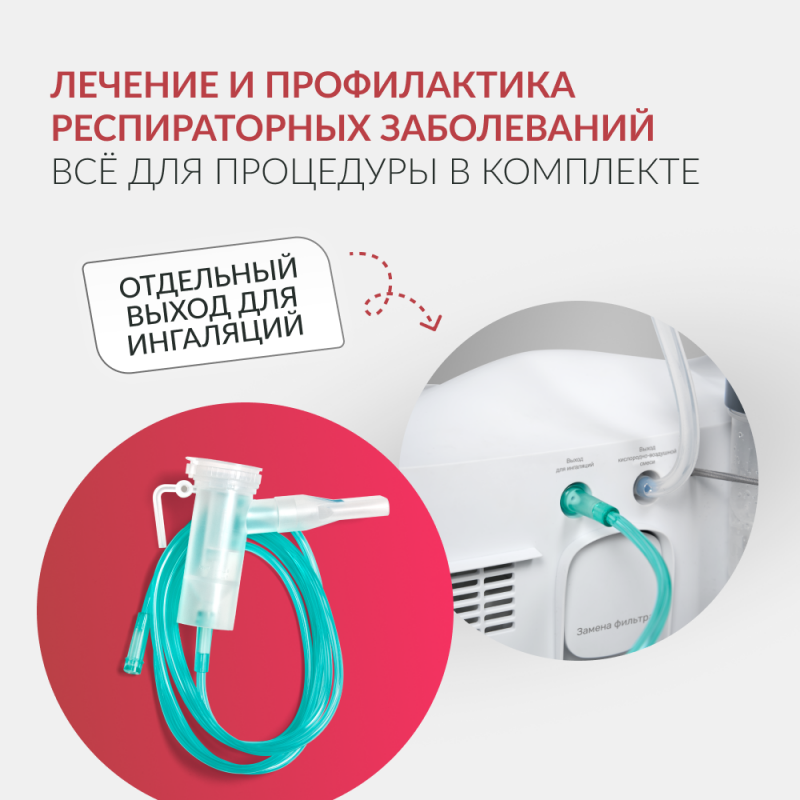 На панели прибора расположен отдельный выход для проведения ингаляций, позволяющий использовать концентратор кислорода в качестве небулайзера при лечении респираторных заболеваний. Набор для ингаляций, состоящий из соединительного воздушного шланга, распылителя и мундштука, входит в комплект.