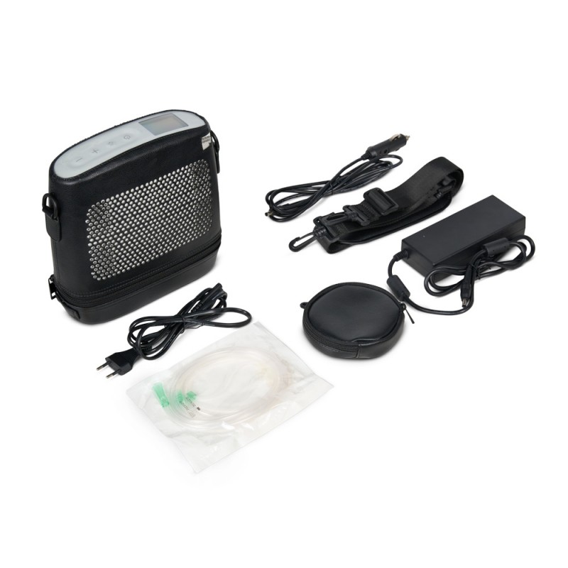 В комплекте с концентратором кислорода поставляется аккумулятор и кабель питания с адаптером для подзарядки или работы от сети. Кроме того, в комплекте есть носовая канюля, чтобы сразу приступить к процедурам. Ремень для переноски на плече и вместительная сумка позволяют с удобством хранить и транспортировать прибор вместе с комплектующими.