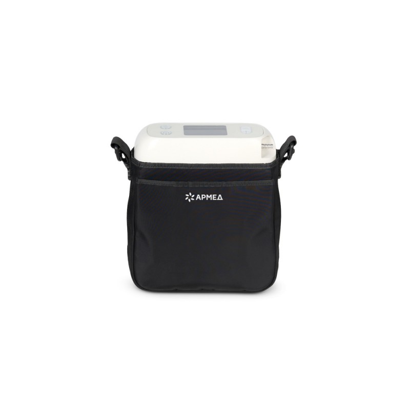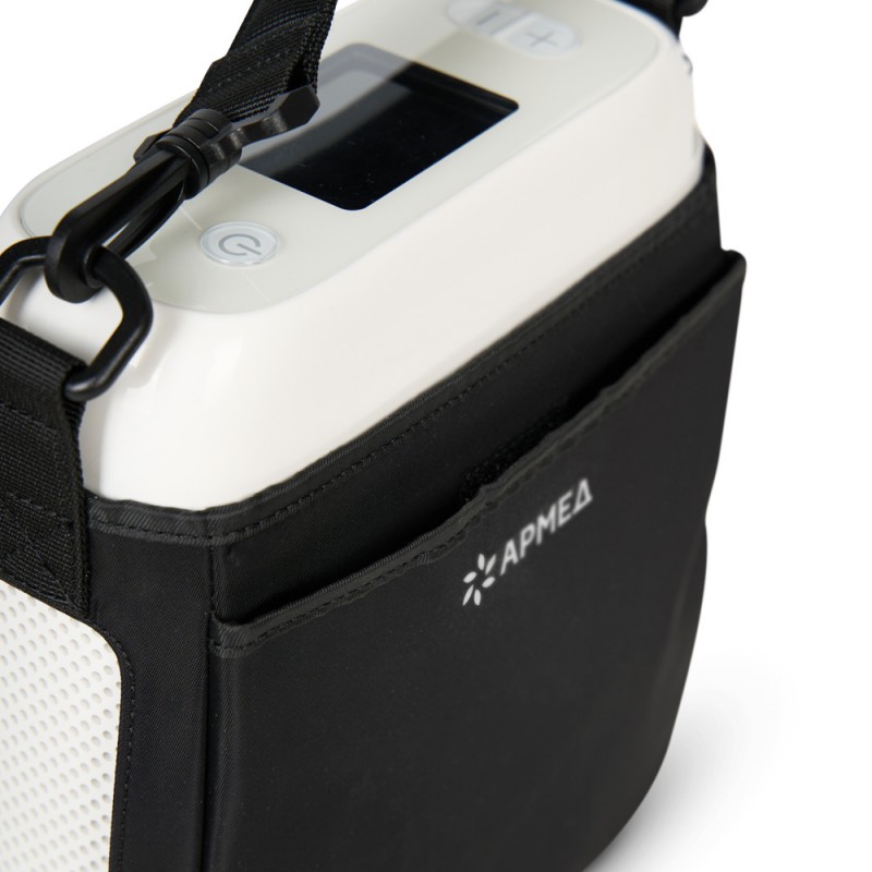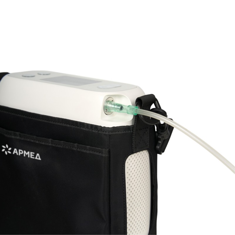 В комплекте с концентратором кислорода поставляется аккумулятор, а также кабель питания с адаптером для подзарядки или работы от сети. Также в комплекте есть носовая канюля, чтобы сразу приступить к процедурам. Ремень для переноски на плече и вместительная сумка позволяют с удобством хранить и транспортировать прибор вместе с комплектующими.