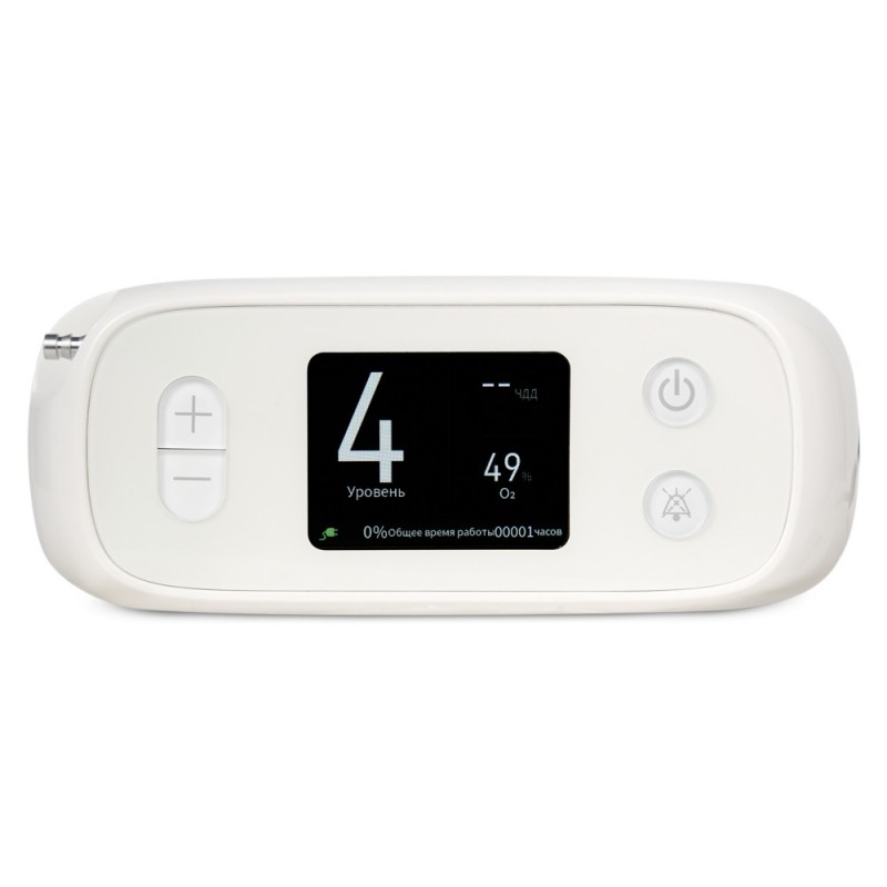 Для удобства и безопасности использования на дисплее прибора отображается отработанное время, текущая концентрация кислорода в кислородно-воздушной смеси, частота дыхания пользователя и выбранный уровень потока. Это позволяет контролировать процедуру, избегая нехватки или перенасыщения кислородом. Также на дисплей выводится уровень заряда аккумулятора, чтобы вовремя подзаряжать прибор.