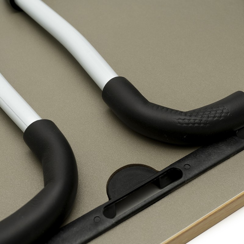 Столешница выполнена из дерева и имеет гибкий пластиковый обод для предотвращения падения предметов. Складной механизм ножек столика оборудован мягкими амортизирующими накладками, делающими использование Barry Porta на кровати особенно комфортным.