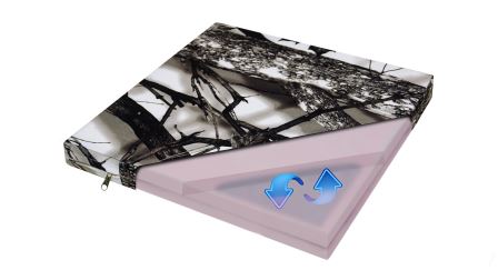Два слоя высокоэластичного пенополиуретана имеют между собой гелевый упруго-перетекающий элемент, который имеет четыре камеры совмещенные между собой каналами, по которым в момент нагрузки перераспредяется гелевая масса. Благодаря этому, давление тела, равномерно распределяет на поверхности сидения в области таза, востанавливая микроциркуляцию крови. Подушка имеет съемный чехол из влагонепроницаемого, паропроницаемого материала на молнии. Высокоэластичный пенополиутретан, между слоями которого, расположена гелевый упруго-перетекающий элемент, размер 380х380мм. Съемный чехол на молнии, имеет мембранную паропроницаемую, влагонепроницаемую ткань, гипоаллергенную и устойчивую против микроорганизмов, пылевых клещей, морозоустойчивость, долговечность.