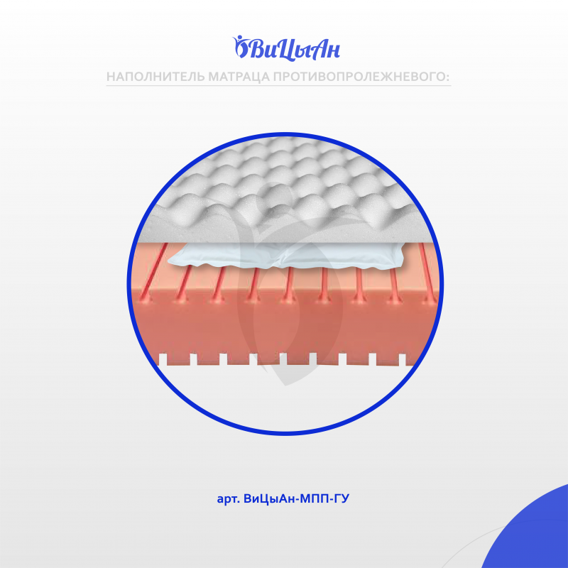Матрац изготовлен из эластичного пенополиуретана со специальным трапециевидным профилем, с эффектом "воздушной подушки", гелевым наполнителем и натуральным латексом, это сочетание эффективно распределяет давление тела пациента на поверхности ложа.Матрац предназначен для людей с нарушением функций опорно-двигательного аппарата и нервной системы в целях предотвращения пролежней. Профилактика пролежней при длительном лежании. Обеспечение максимального комфорта. Комплексная реабилитация лечения пролежней. Для комфортного сна. Имеет направление положения.Матрац изготовлен из эластичного пенополиуретана со специальным трапециевидным профилем, с эффектом "воздушной подушки", гелевым наполнителем и натуральным латексом, это сочетание эффективно распределяет давление тела пациента на поверхности ложа.Матрац предназначен для людей с нарушением функций опорно-двигательного аппарата и нервной системы в целях предотвращения пролежней. Профилактика пролежней при длительном лежании. Обеспечение максимального комфорта. Комплексная реабилитация лечения пролежней. Для комфортного сна. Имеет направление положения. Уникальная конструкция матраца имеет в основании трапецевидный профиль, который формирует независимые конусы, эффективно распределяющие давление тела на поверхности ложа кровати. Поперечный профиль на нижней стороне матраца, позволяет ему принимать форму ложа, 1-2-3-4-секционной кровати. В зонах повышенного риска образования пролежней расположены ниши со вставками из 6-ти упруго-перетекающих гелевых элементов по 4-ре независимых камер.