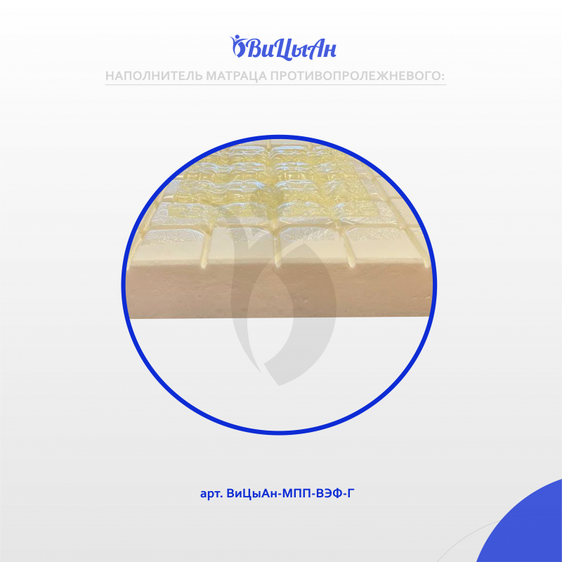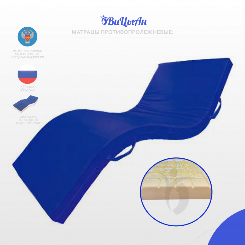 Изделие предназначено для равномерного распределения давления на тело пациента, с целью профилактики образования пролежней у больных с нарушением опорно-двигательного аппарата, для снятия нагрузки на позвоночник.Показания к применению: Необходимость равномерного распределения давления на тело пациента, с целью профилактики образования пролежней у больных с нарушением опорно-двигательного аппарата, для снятия нагрузки на позвоночник.Противопоказания: Вытяжение шейные и скелетные, травмы позвоночника и спинного мозга, при наличии открытых пролежней и по остальным противопоказаниям необходимо проконсультироваться с лечащим врачом.Побочные эффекты: не выявлены.Основа матраца - вязкоэластичный формовой пенополиуретан состоящий их трех блоков, сверху на каждом блоке расположена гелевая вставка, каждый блок в отдельности имеет съемный чехол из спанбонда.Чехол - вариант исполнения ТК-1/1 - чехол комбинированный, верх (рабочая поверхность) чехла изготавливается из ткани ТК-1/1. Основа трикотажное полотно, плотность 210 г/м² с влагонепроницаемой, паропроницаемой полиуретановой мембраной. Состав: полиэстер 82%, полиуретан 18%, нижняя поверхность чехла имеет (которая соприкасается с поверхностью ложа кровати) ручки чехла из прочной, износостойкой ткани.Предельные отклонения матрацев не должны превышать: по длине ± 10 мм;по ширине ± 10 мм; по высоте ± 15 мм;Допустимое отклонение по массе наполнителя и чехла должно составлять не более ± 15%Преимущества противопролежневого матраса из вязкожластичного пенополиуретана с гелевой вставкой неоспоримы и оказывают положительное влияние на здоровье и комфорт человека, особенно для тех, кто проводит много времени в постели, например, пациентов, пролежни у которых представляют серьезную проблему. Во-первых, гелевая вставка обеспечивает равномерное распределение веса тела и предотвращает возникновение точечного сдавливания. Это особенно важно для людей с ограниченной подвижностью, так как они могут проводить большую часть времени в постели, страдая от давления на определенные участки кожи.Во-вторых, вязкоэластичный материал обладает способностью подстраиваться под форму тела и сохранять эту форму некоторое время после прекращения нагрузки. Это способствует максимальной адаптации матраса к индивидуальным контурам тела каждого человека и благоприятно сказывается на общем комфорте и качестве сна. Матрас с гелевой вставкой позволяет снизить напряжение мышц и суставов, снижая дискомф