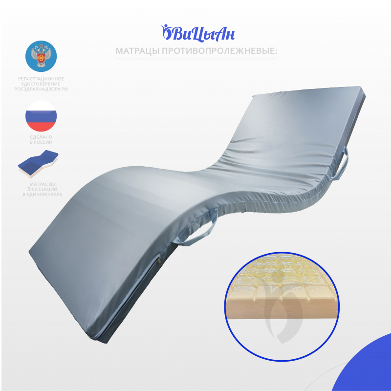 Изделие предназначено для равномерного распределения давления на тело пациента, с целью профилактики образования пролежней у больных с нарушением опорно-двигательного аппарата, для снятия нагрузки на позвоночник.Показания к применению: Необходимость равномерного распределения давления на тело пациента, с целью профилактики образования пролежней у больных с нарушением опорно-двигательного аппарата, для снятия нагрузки на позвоночник.Противопоказания: Вытяжение шейные и скелетные, травмы позвоночника и спинного мозга, при наличии открытых пролежней и по остальным противопоказаниям необходимо проконсультироваться с лечащим врачом.Побочные эффекты: не выявлены.Основа матраца - вязкоэластичный формовой пенополиуретан состоящий их трех блоков, сверху на каждом блоке расположена гелевая вставка, каждый блок в отдельности имеет съемный чехол из спанбонда. Чехол - вариант исполнения ТК-12 - чехол комбинированный, верх (рабочая поверхность) чехла изготавливается из ткани ТК-12. Основа трикотажное полотно, плотность 135-150 г/м² с влагонепроницаемой, паропроницаемой полиуретановой мембраной. Состав: полиэстер 82%, полиуретан 18%, нижняя поверхность чехла имеет (которая соприкасается с поверхностью ложа кровати) ручки чехла из прочной, износостойкой ткани. Предельные отклонения матрацев не должны превышать:по длине ± 10 мм; по ширине ± 10 мм;по высоте ± 15 мм;Допустимое отклонение по массе наполнителя и чехла должно составлять не более ± 15%Преимущества противопролежневого матраса из вязкожластичного пенополиуретана с гелевой вставкой неоспоримы и оказывают положительное влияние на здоровье и комфорт человека, особенно для тех, кто проводит много времени в постели, например, пациентов, пролежни у которых представляют серьезную проблему. Во-первых, гелевая вставка обеспечивает равномерное распределение веса тела и предотвращает возникновение точечного сдавливания. Это особенно важно для людей с ограниченной подвижностью, так как они могут проводить большую часть времени в постели, страдая от давления на определенные участки кожи.Во-вторых, вязкоэластичный материал обладает способностью подстраиваться под форму тела и сохранять эту форму некоторое время после прекращения нагрузки. Это способствует максимальной адаптации матраса к индивидуальным контурам тела каждого человека и благоприятно сказывается на общем комфорте и качестве сна. Матрас с гелевой вставкой позволяет снизить напряжение мышц и суставов, снижая дискомфор