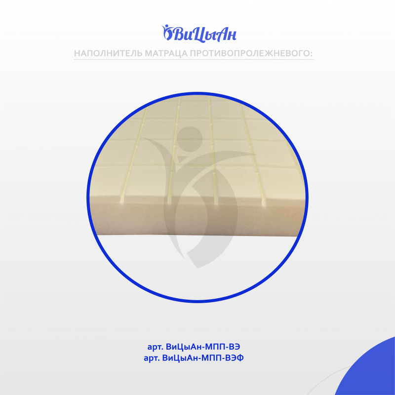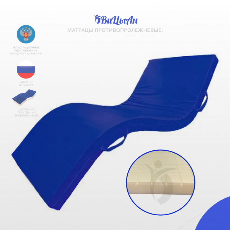 Изделие предназначено для равномерного распределения давления на тело пациента, с целью профилактики образования пролежней у больных с нарушением опорно-двигательного аппарата, для снятия нагрузки на позвоночник. Показания к применению: Необходимость равномерного распределения давления на тело пациента, с целью профилактики образования пролежней у больных с нарушением опорно-двигательного аппарата, для снятия нагрузки на позвоночник. Противопоказания: Вытяжение шейные и скелетные, травмы позвоночника и спинного мозга, при наличии открытых пролежней и по остальным противопоказаниям необходима консультация с врачом. Побочные эффекты: не выявлены.Основа матраца - вязкоэластичный формовой пенополиуретан состоящий их трех блоков, сверху на каждом блоке расположена гелевая вставка, каждый блок в отдельности имеет съемный чехол из спанбонда. Чехол комбинированный - вариант исполнения, верх (рабочая поверхность) чехла изготавливается из ткани ТК-1/1. Основа трикотажное полотно, плотность 200-135 г/м² с влагонепроницаемой, паропроницаемой полиуретановой мембраной. Состав: полиэстер 82%, полиуретан 18%, нижняя поверхность чехла имеет (которая соприкасается с поверхностью ложа кровати) ручки чехла из прочной, износостойкой ткани. Предельные отклонения матрацев не должны превышать: по длине ± 10 мм; по ширине ± 10 мм; по высоте ± 15 мм; Допустимое отклонение по массе наполнителя и чехла должно составлять не более ± 15%.